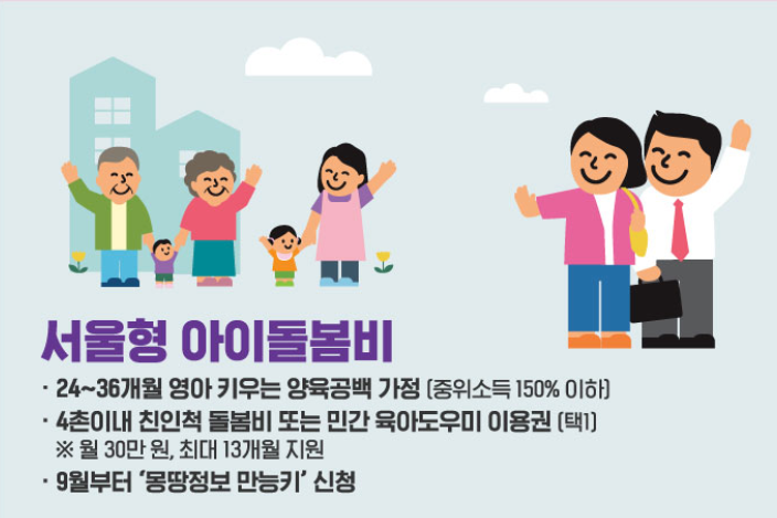 서울에 거주하며 만 24개월~36개월 영아가 있고 기준 중위소득 150% 이하의 가정으로 양육에 공백이 있는 가정이 지원대상입니다.